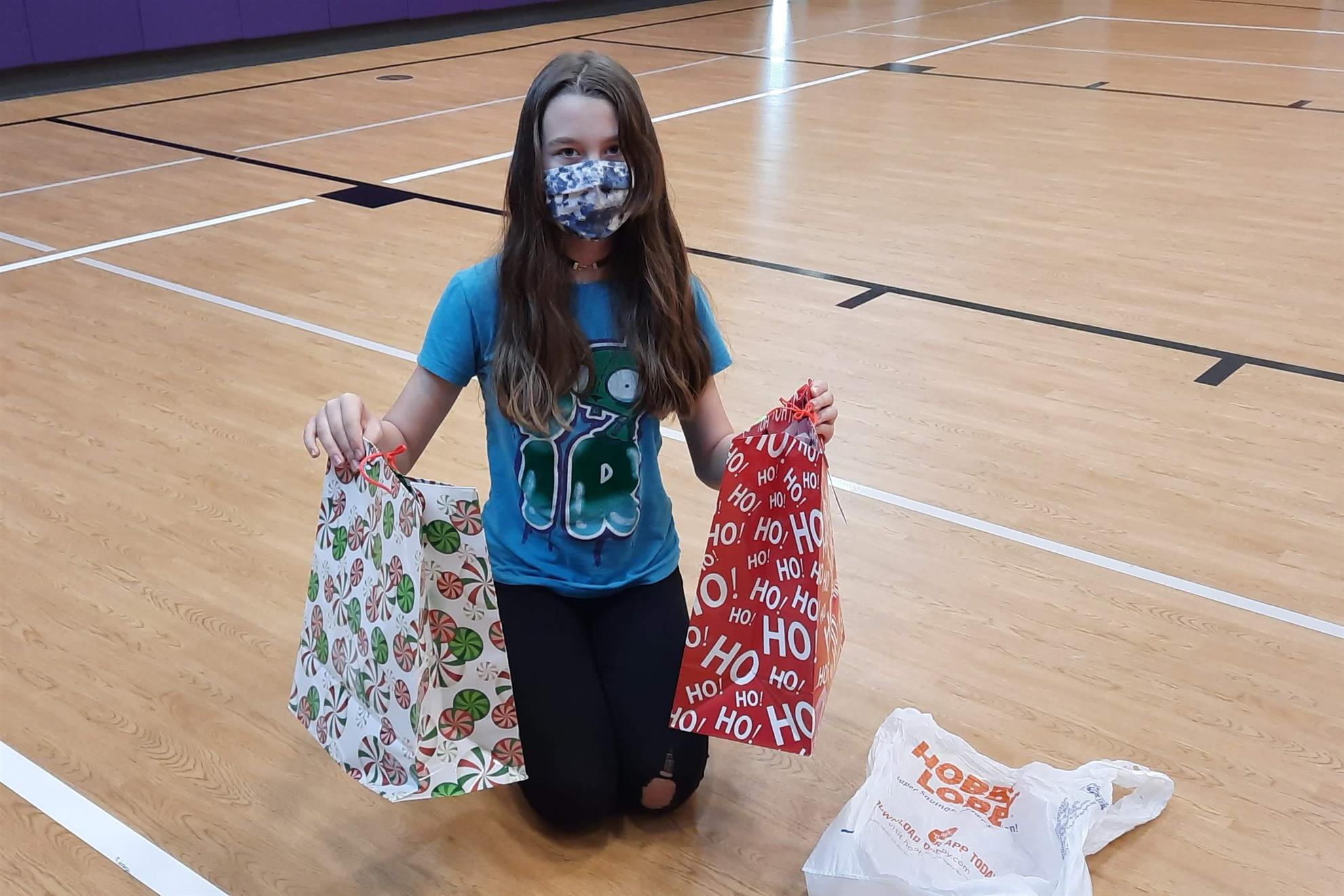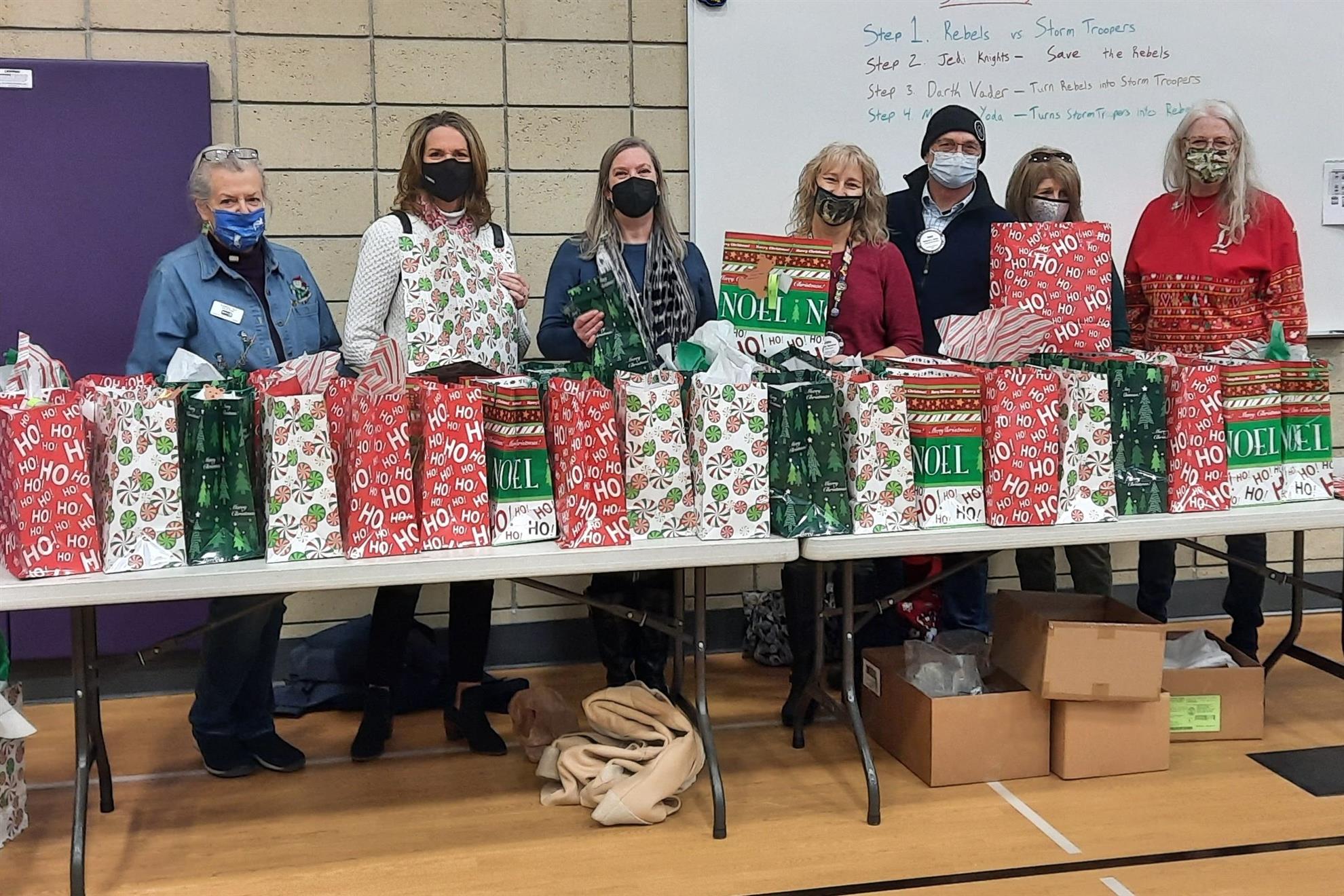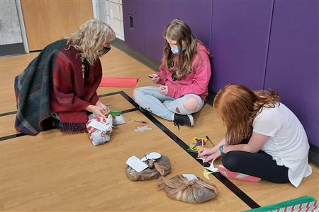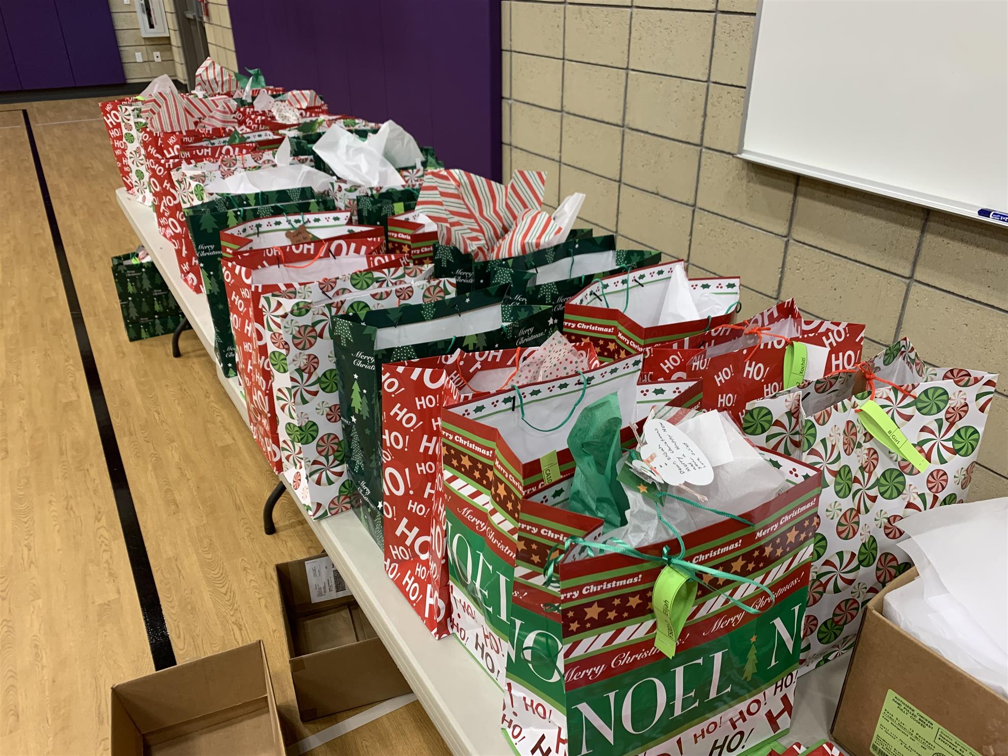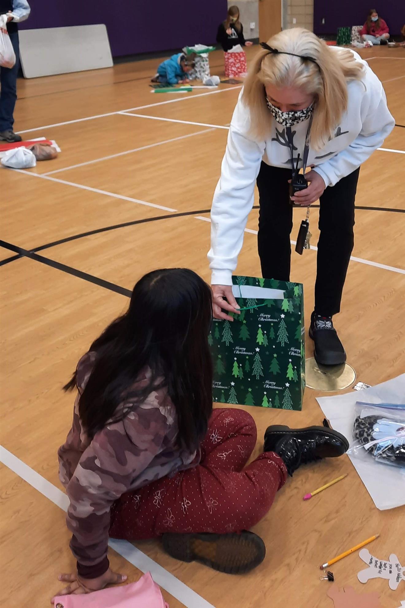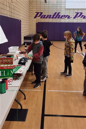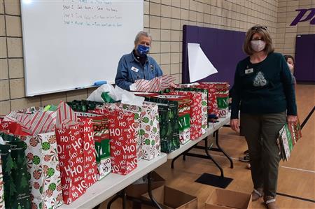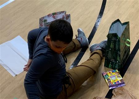 Dec. 9, 2021, event with Mr. Brad Fackrell's 5th-grade class from Pierce Park Elementary. We provided hats, mittens, $5 McDonald's gift cards and other small items for 42 Family Advocate-sponsored youth. The 21 5th-grade students wrote cards and put the gifts in bags with tissue. This event occurred in the new Pierce Park gymnasium.