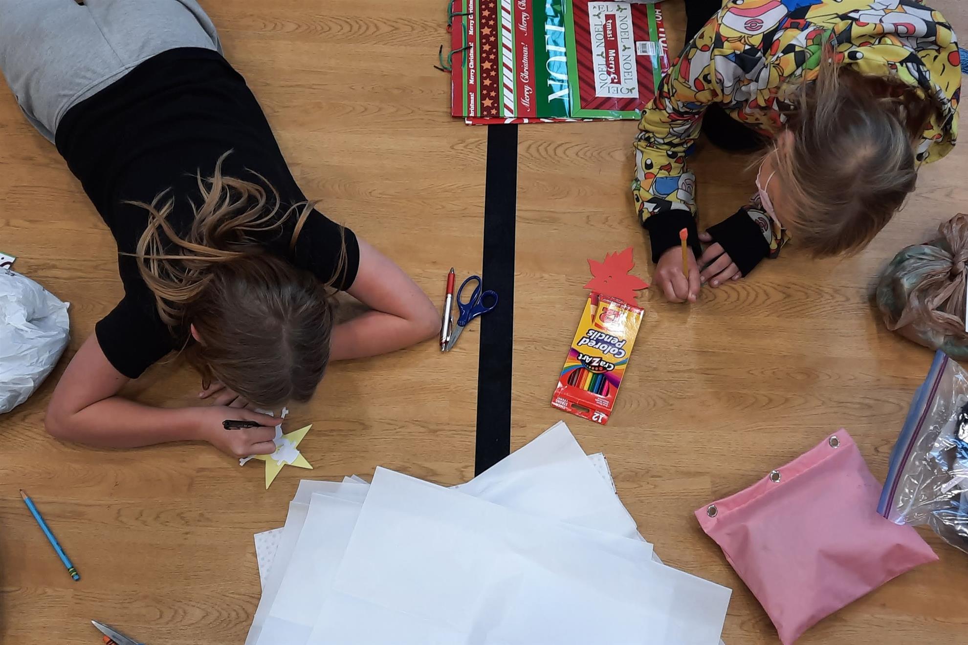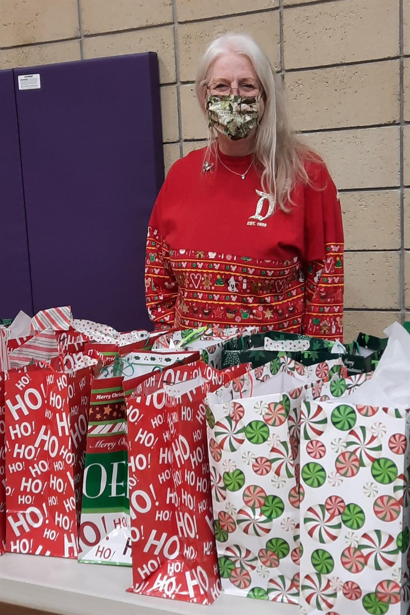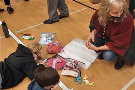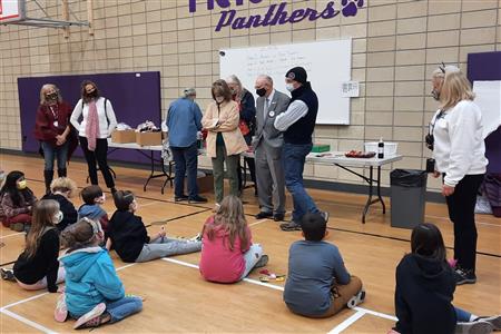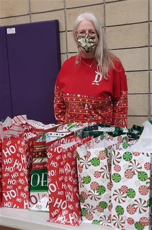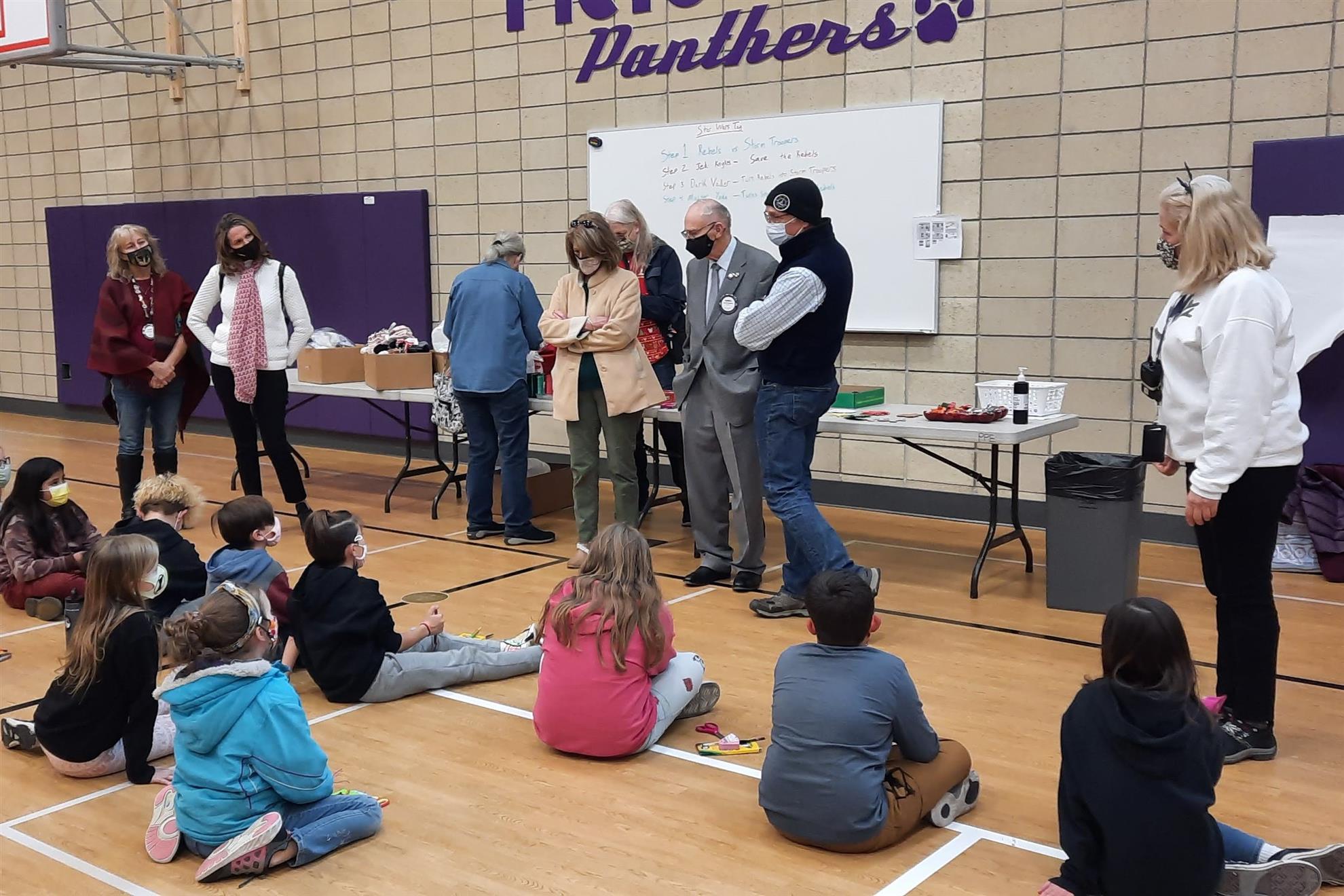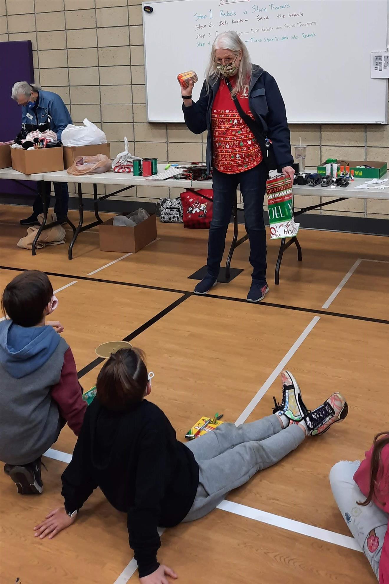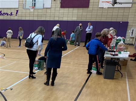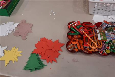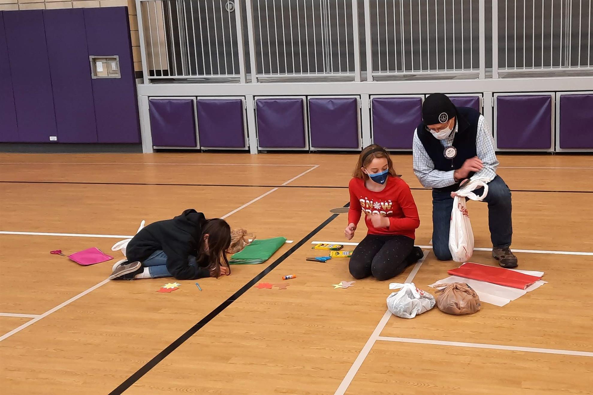 Dec. 9, 2021, event with Mr. Brad Fackrell's 5th-grade class from Pierce Park Elementary. We provided hats, mittens, $5 McDonald's gift cards and other small items for 42 Family Advocate-sponsored youth. The 21 5th-grade students wrote cards and put the gifts in bags with tissue. This event occurred in the new Pierce Park gymnasium.